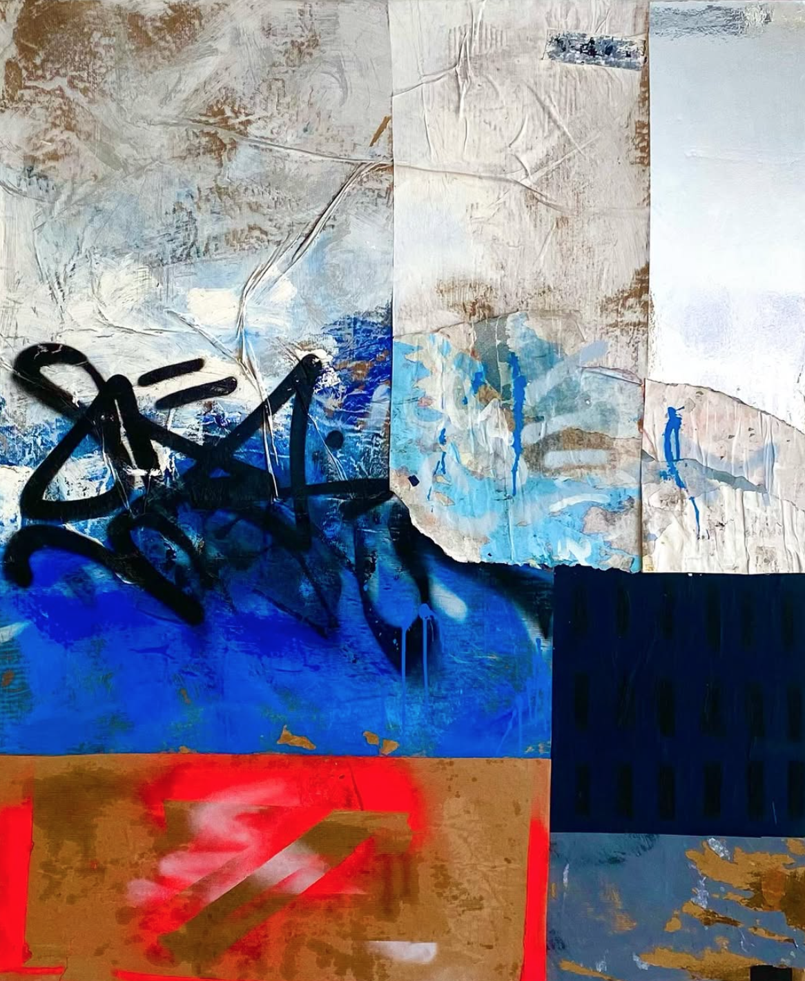 Ratio painterly passion and physical power of abstraction and pure expressionism vibrates the grit of the street,unapolgentically. The intense collages embeded with violent marks, sweep through his charismatic paintings like a tornado guarantee not to last. Across architectural textured surfaces, that protest secretly graffitied messages. Resonate a silent surface language full of intimacy that is physical with contrasting colours that powerfully engages the viewer almost incite violence causing a pyrotechnic impression.